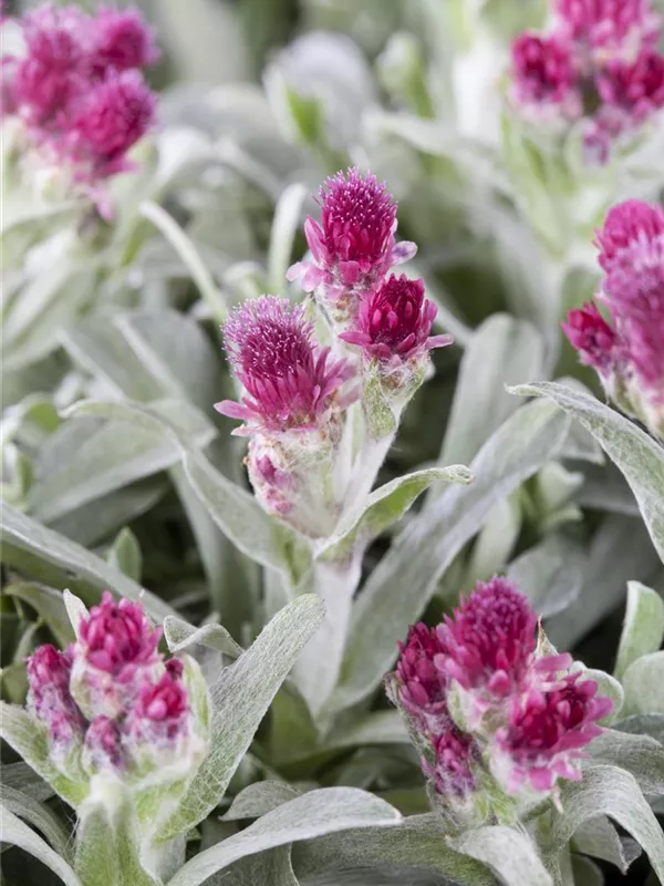 Antennaria dioica 'Rubra' bildet ballförmige, rote Blüten ab Mai.