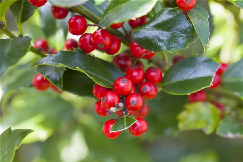 Damit die grünen Kugeln auch richtig festlich aussehen, werden sie jetzt noch geschmückt. Dafür einfach einige rote Beeren mit Heißkleber auf den grünen Kugeln festkleben. Ilex hat zu dieser Jahreszeit besonders schöne rote oder gelbe Beeren, die sich gut dafür benutzen lassen. Wer mag kann dann noch eine goldene Schleife an der Oberseite der Kugeln an der Paketschnur befestigen und die Kugeln dann ins Fester oder vor die Haustür hängen.
