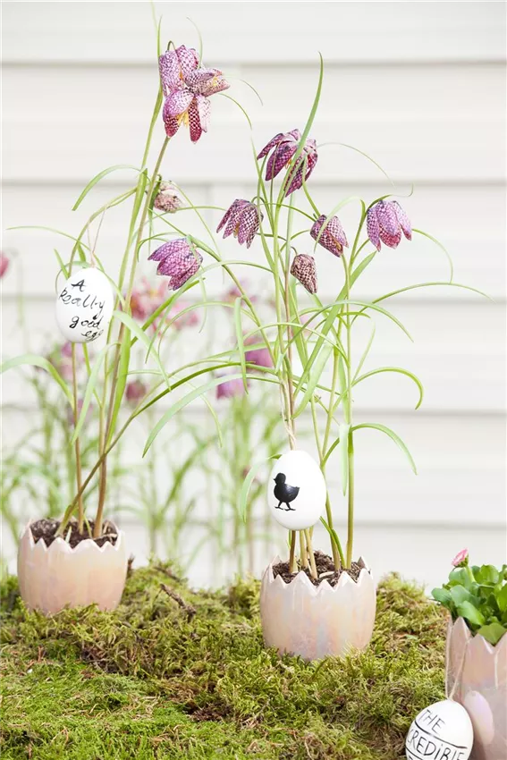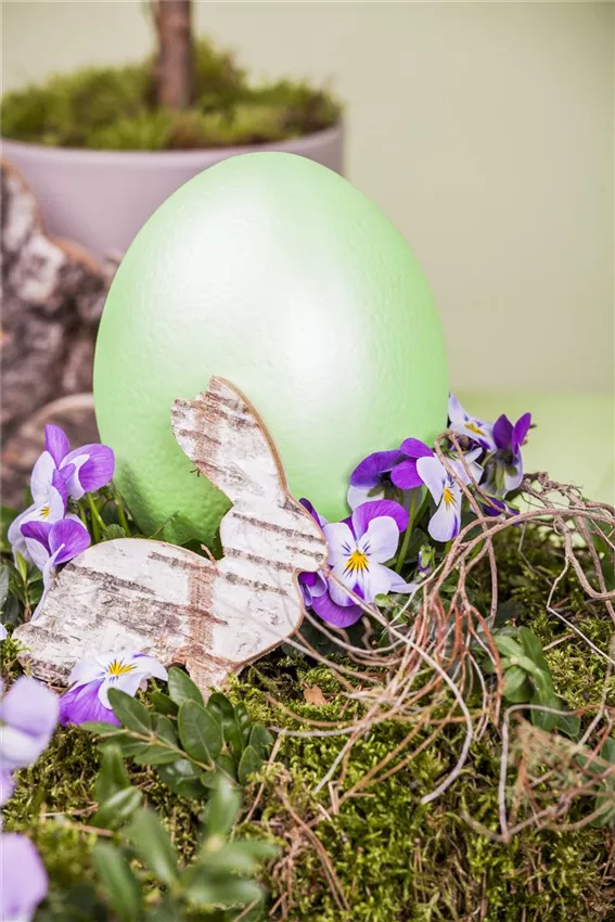 Vögel bereiten ihre Nester für ihren Nachwuchs vor und machen es ihnen besonders bequem. Das passiert jetzt auch mit dem Netz im Osterkranz. Dafür wird das kleine Nest mit Moos ausgekleidet, sodass eine flache Ebene entsteht. Die Eier werden oben so aufgeschlagen, dass die Öffnung groß genug ist, damit die Wurzeln der Pflanzen in die Eierschale passen. Die Eier werden dann ausgespült und bekommen mit Draht und Heißkleber ein Füßchen, mit dem die Eier ganz leicht in das Moos gesteckt werden können. Und dann können die Pflänzchen einziehen.